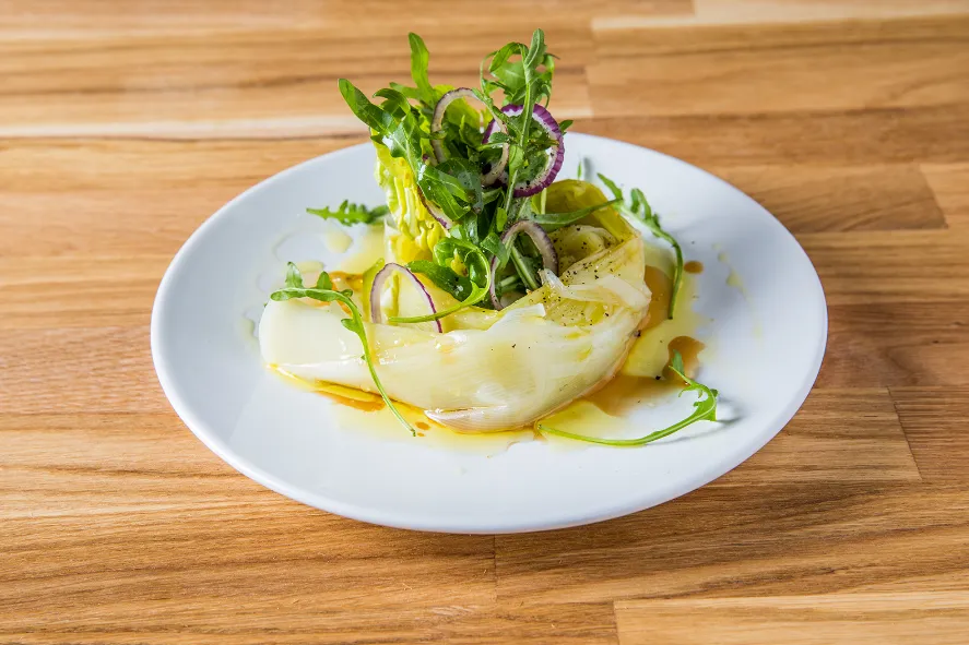 Des poireaux fondants accompagnés d’une vinaigrette à l’huile d’olive et au citron.