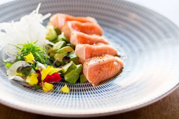 C’est un morceau de saumon mariné dans l’huile de sésame et la sauce soja, saisi sur toutes les faces …